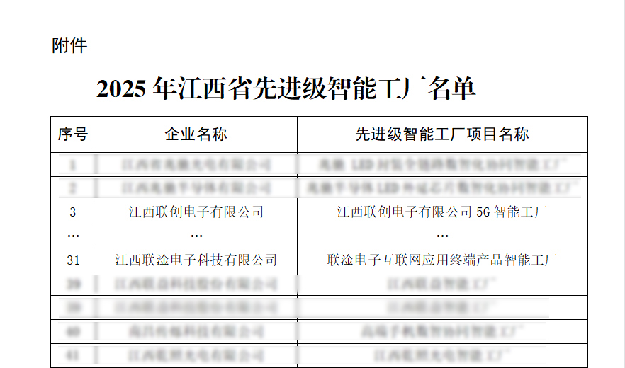 近日,江西省工业和信息化厅正式公布2025年江西省“先进级智能工厂”名单,186家企业入选。其中雷火·竞技(中国)-全球领先的电竞赛事平台,、江西联淦电子科技有限公司2家联创电子系企业名列榜单。这标志着公司在智能制造领域的创新成果再次获得政府权威认可。